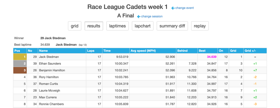 I was starting Pole in the A Final and had this because I put in a faster lap time than Rory, so again knew that I needed to get off the line really well so that Rory was kept behind me. I got off of the line really well and held the lead with lots of contact going on behind me, all fighting for position. With this going on I was left to build a gap and start pulling a lead. I managed to secure the win for Round 1, therefore I banked 38 points this week as I won a heat (maximum of 12 points), I won the A Final (maximum 25 points) and I also had the fastest lap of the day which earned me an additional point.